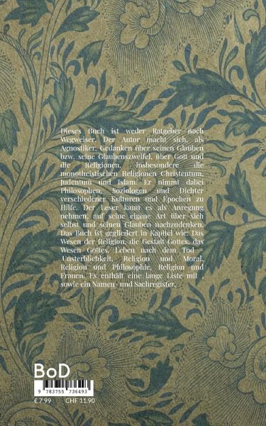 Dieses Buch ist weder Ratgeber noch Wegweiser. Der Autor macht sich, als Agnostiker, Gedanken über seinen Glauben bzw. seine Glaubenszweifel, über Gott und die Religionen, insbesondere die monotheistischen Religionen Christentum, Judentum und Islam. Er nimmt dabei Philosophen, Soziologen und Dichter verschiedener Kulturen und Epochen zu Hilfe. Der Leser kann es als Anregung nehmen, auf seine eigene Art über sich selbst und seinen Glauben nachzudenken. Das Buch ist gegliedert in Kapitel wie: Das Wesen der Religion, die Gestalt Gottes, das Wesen Gottes, Leben nach dem Tod - Unsterblichkeit, Religion und Moral, Religion und Philosophie, Religion und Frauen. Es enthält eine lange Liste mit Literaturhinweisen, sowie ein Namen- und Sachregister.