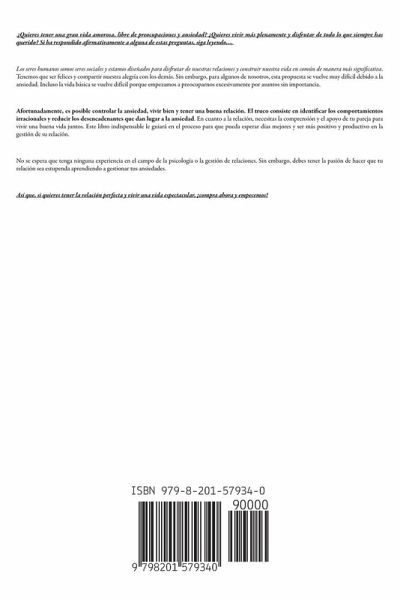 ¿Quieres tener una gran vida amorosa, libre de preocupaciones y ansiedad? ¿Quieres vivir más plenamente y disfrutar de todo lo que siempre has querido? Si ha respondido afirmativamente a alguna de estas preguntas, siga leyendo.... Los seres humanos somos seres sociales y estamos diseñados para disfrutar de nuestras relaciones y construir nuestra vida en común de manera más significativa. Tenemos que ser felices y compartir nuestra alegría con los demás. Sin embargo, para algunos de nosotros, esta propuesta se vuelve muy difícil debido a la ansiedad. Incluso la vida básica se vuelve difícil porque empezamos a preocuparnos excesivamente por asuntos sin importancia. Afortunadamente, es posible controlar la ansiedad, vivir bien y tener una buena relación. El truco consiste en identificar los comportamientos irracionales y reducir los desencadenantes que dan lugar a la ansiedad. En cuanto a la relación, necesitas la comprensión y el apoyo de tu pareja para vivir una buena vida juntos. Este libro indispensable le guiará en el proceso para que pueda esperar días mejores y ser más positivo y productivo en la gestión de su relación. No se espera que tenga ninguna experiencia en el campo de la psicología o la gestión de relaciones. Sin embargo, debes tener la pasión de hacer que tu relación sea estupenda aprendiendo a gestionar tus ansiedades. Así que, si quieres tener la relación perfecta y vivir una vida espectacular, ¡compra ahora y empecemos!