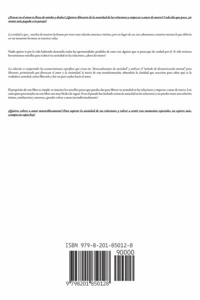 ¿Pensar en el amor te llena de miedos y dudas? ¿Quieres liberarte de la ansiedad de las relaciones y empezar a amar de nuevo? Cada día que pasa, ¿te sientes más pegado a tu pareja? La verdad es que... muchos de nosotros luchamos por tener una relación amorosa e íntima, pero en lugar de eso, nos saboteamos a nosotros mismos lo que debería ser un momento hermoso en nuestras vidas. Nadie quiere ir por la vida habiendo destruido todas las oportunidades perdidas de estar con alguien que se preocupe de verdad por él. Si sólo tuvieras herramientas sencillas para reducir tu ansiedad en las relaciones, ¡ahora las tienes! La solución es comprender los acontecimientos específicos que crean tus "desencadenantes de ansiedad" y utilizar el "método de desintoxicación mental" para liberarte, permitiendo que florezcan el amor y la intimidad. A través de esta transformación, obtendrás la claridad que necesitas para saber qué es la verdadera ansiedad, cómo liberarla y dar un paso audaz hacia el amor. El propósito de este libro es simple: te muestra los sencillos pasos que puedes dar para liberar tu ansiedad en las relaciones y empezar a amar de nuevo. Los conceptos presentados en este libro son muy fáciles de seguir. Si en el pasado has luchado contra la ansiedad en las relaciones y no puedes tener una relación íntima, satisfactoria y amorosa, ¡puedes volver a amar incondicionalmente! ¿Quieres volver a amar maravillosamente? Para superar la ansiedad de tus relaciones y volver a sentir esos momentos especiales, no esperes más, ¡compra tu copia hoy!