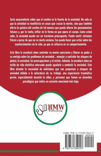 Sería sorprendente saber que su cerebro es la fuente de su ansiedad. No solo es que la ansiedad se manifiesta en cosas que cruzan su mente, sino que también afecta la química de su cerebro de tal manera que puede alterar los pensamientos futuros y, por lo tanto, influir en la forma en que opera su cuerpo. Como usted sabe, la ansiedad puede ser un trastorno preocupante. Puede sentir síntomas físicos a pesar de que no se sienta ansioso. Eso puede hacer que actúe sobre los acontecimientos de la vida, ya que se refuerza en su comportamiento. Este libro, le guiará con lo siguiente: - Cómo controlar su mente consciente y liberar su poder a su ventaja sobre los problemas de ansiedad. - Manejar y controlar los ataques de pánico, la ansiedad, las preocupaciones y el estrés. - Comprender cómo un estilo de vida dietético adecuado puede ayudarle a combatir la ansiedad. Además, este libro atiende la necesidad de individuos que son propensos a ataques de ansiedad debido a la naturaleza de su trabajo, una experiencia traumática previa, especialmente durante la niñez, y personas que tienen un desorden psicológico que indica un cociente emocional más bajo.