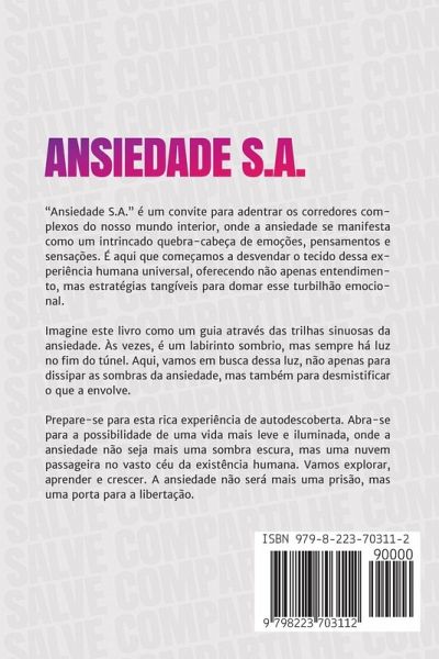 "Ansiedade S.A." é um convite para adentrar os corredores complexos do nosso mundo interior, onde a ansiedade se manifesta como um intrincado quebra-cabeça de emoções, pensamentos e sensações. É aqui que começamos a desvendar o tecido dessa experiência humana universal, oferecendo não apenas entendimento, mas estratégias tangíveis para domar esse turbilhão emocional. Imagine este livro como um guia através das trilhas sinuosas da ansiedade. Às vezes, é um labirinto sombrio, mas sempre há luz no fim do túnel. Aqui, vamos em busca dessa luz, não apenas para dissipar as sombras da ansiedade, mas também para desmistificar o que a envolve. Abra-se para a possibilidade de uma vida mais leve e iluminada, onde a ansiedade não seja mais uma sombra escura, mas uma nuvem passageira no vasto céu da existência humana. Vamos explorar, aprender e crescer. A ansiedade não será mais uma prisão, mas uma porta para a libertação. Prepare-se para esta rica experiência de autodescoberta.