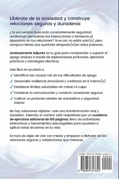 Libérate de la ansiedad y construye relaciones seguras y duraderas ¿Te encuentras buscando constantemente seguridad, analizando demasiado las interacciones o temiendo el abandono en tus relaciones? Si es así, no estás solo(a), pero tampoco tienes que quedarte atrapado(a) en estos patrones. ANSIOSAMENTE ADJUNTO es tu guía para comprender y superar el apego ansioso a través de exploraciones profundas, ejercicios prácticos y estrategias efectivas. Este libro te ayudará a: ¿¿ Identificar las causas raíz de tus dificultades de apego ¿¿ Desarrollar resiliencia emocional y confianza en ti mismo(a) ¿¿ Establecer límites saludables sin miedo ni culpa ¿¿ Fortalecer la comunicación y construir conexiones seguras ¿¿ Cultivar un profundo sentido de autoestima y seguridad interior No hay soluciones rápidas-solo una transformación real y duradera. Además, tu camino está respaldado por un cuaderno de ejercicios adicional de 100 páginas, lleno de actividades interactivas y herramientas descargables para ayudarte a aplicar estas lecciones en tu vida. Es hora de dejar de vivir con miedo y empezar a disfrutar de las relaciones seguras y satisfactorias que mereces.