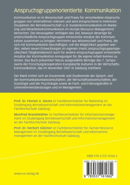 Einleitung: Anspruchsgruppenorientierte Kommunikation - Idee und Umsetzung einer integrierten Betrachtung.- Einleitung: Anspruchsgruppenorientierte Kommunikation - Idee und Umsetzung einer integrierten Betrachtung.- Kundenkommunikation.- Das Externe Vorschlagswesen - Entwicklung eines Kommunikationssystems zur Integration von Kunden in den Innovationsprozess.- Die Folgen der Low- und High-End-Polarisierung auf die Marketingkommunikation der deutschen Automobilindustrie.- The 30-Second-Sale: Snap impressions of a retail sales person influence consumers decision making.- "We want you to love our product" - An English-German Translation Analysis of Consumer Oriented Language on Drink Packaging Texts.- "Beeing hopeful" oder wie die Biene zum Corporate Weblog kommt: Sprachliche, inhaltliche und gestalterische Mittel der Interaktivität.- Dem Kundenwunsch auf der Spur: Informationsgewinnung in netzbasierter Kommunikation.- Möglichkeiten der visuellen Darstellung von Weinproduktattributen durch piktogramme.- Marketing für tischler - Die Rolle der Kommunikation im Marketing-Mix österreichischer handwerksbetriebe.- Marketing und Kommunikation mit Musik: Das Spiel mit den Emotionen.- Mitarbeiterkommunikation.- Kultur(en) der internen unternehmenskommunikation - Einfluss und Gestaltungsmöglichkeiten. Ein forschungsprojekt in zwei Institutionen im Gesundheits- und Bildungssektor.- Leitbilder auf dem Prüfstand.- A constructivist approach to communication and projection.- Proxemik in der Teamdynamik - Raumsprache diktieren und interpretieren.- Positionierung und Profilierung starker Arbeitgebermarken: Employer Branding als strategisches Ziel anspruchsgruppenorientierter Personalkommunikation.- Spezielle und multiple Anspruchsgruppen.- Stile universitärerWertekommunikation - Ein Vergleich im europäischen Wirtschaftsraum.- Modelle der Integrierten Kommunikation.- Kommunikation betrieblicher Entscheidungssituationen - Eine empirische Analyse der Auswirkungen von Framing.- Diachroner Wandel von Zielgruppenansprachen - veranschaulicht anhand der bildschematischen Konzeptualisierung in Jahresberichten.- Lust auf Perspektivenwechsel - Ein Experiment zur Verhaltensänderung.- Einige Überlegungen zu einer Übersetzungstheorie von Tourismuswebsites.- Integrierte Kommunikation in Unternehmen - Forschungsstand, empirische Befunde, Bewertungsansatz.- Investor Relations Newsletters - Funktion, Aufbau und Sprache.- Virtuelle Unternehmenskommunikation: Die neue EU- Richtlinie über die Ausübung von Aktionärsrechten.- Stakeholderorientierte Informations- und Kommunikationspolitik in Nonprofit-Organisationen - Leistungsberichterstattung als Instrument zur strategischen Beziehungsgestaltung.- Country-Branding als Identitätsmetapher.- City-Branding - Markenbildung durch Auswahl und Einsatz von Wertprägungen.- Mehr Orientierung durch Orienteering - Neue Perspektiven für erfolgreiche Teamkommunikation durch paralleles Lernen auf unterschiedlichen Ebenen..- Schnittstellenkommunikation im Produktentwicklungsprozess als erfolgsrelevanter Faktor - Eine Analyse innovationsorientierter deutscher, österreichischer und Schweizer Unternehmen.- Communication matters - Netzwerkkonstitution im Entrepreneurship.
