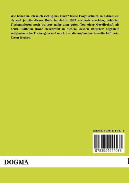 Wie benehme ich mich richtig bei Tisch? Diese Frage scheint so aktuell wie eh und je. Als dieses Buch im Jahre 1895 erstmals erschien, gehörten Tischmanieren noch weitaus mehr zum guten Ton einer Gesellschaft als heute. Wilhelm Brand beschreibt in diesem kleinen Ratgeber allgemein zeitgenössische Tischregeln und möchte so die angenehme Gesellschaft beim Essen fördern.