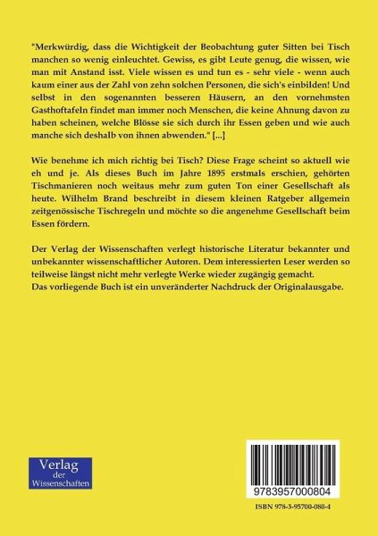 Wie benehme ich mich richtig bei Tisch? Diese Frage scheint so aktuell wie eh und je. Als dieses Buch im Jahre 1895 erstmals erschien, gehörten Tischmanieren noch weitaus mehr zum guten Ton einer Gesellschaft als heute. Wilhelm Brand beschreibt in diesem kleinen Ratgeber allgemein zeitgenössische Tischregeln und möchte so die angenehme Gesellschaft beim Essen fördern.