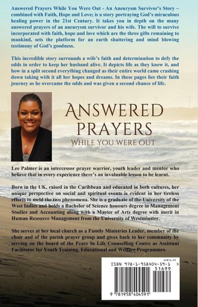 Answered Prayers While You Were Out - An Aneurysm Survivor's Story ~ Combined with Faith, Hope and Love; is a story portraying God's miraculous healing power in the 21st Century. It takes you in depth into the many answered prayers of an aneurysm survivor and his wife as he overcame the odds when he was given a second chance at life. The will to survive, incorporated with faith, hope and love, which are the three gifts remaining to mankind, sets the platform for an earth shattering and mind blowing testimony of God's goodness. This incredible story surrounds a wife's faith and determination to defy all the odds including ignoring the facts presented to her; in order to keep her husband alive. This she did by doing the only thing she knew she was destined to do, to intercede on his behalf and pray without ceasing, fighting battles no one else could see. It depicts life as they knew it, and how in a split second everything changed as their entire world came crashing down taking with it all her hopes and dreams. In these pages lies their faith journey throughout the darkest season of their lives. An insight on coping strategies and the varying stages of recovery is also given to assist those who may find themselves in a similar situation and often times ponder on what to do when they don't know what to do. In the midst of this, the importance of having a personal relationship with our Heavenly Father and trusting him through every situation we face is emphasized; as in spite of how one feels, the views of others, the facts laid out before them or what the world says, it is God who has the final say. This was highlighted in the various ways God came through in this their deepest, darkest season. No matter what we go through here on earth, God sees all knows all and understands all and no matter where you are He is right there with you.