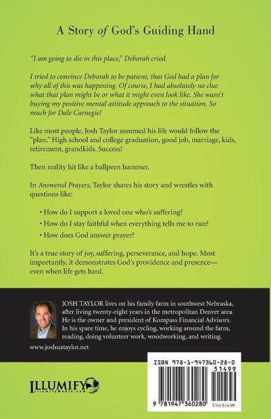 "I am going to die in this place," Deborah cried. I tried to convince Deborah to be patient, that God had a plan for why all of this was happening. Of course, I had absolutely no clue what that plan might be or what it might even look like. She wasn't buying my positive mental attitude approach to the situation. So much for Dale Carnegie! Like most people, Josh Taylor assumed his life would follow the "plan." High school and college graduation, good job, marriage, kids, retirement, grandkids. Success! Then reality hit like a ballpeen hammer. In Answered Prayers, Taylor shares his story and wrestles with questions like: ¿ How do I support a loved one who's suffering? ¿ How do I stay faithful when everything tells me to run? ¿ How does God answer prayer? It's a true story of joy, suffering, perseverance, and hope. Most importantly, it demonstrates God's providence and presence-even when life gets hard.