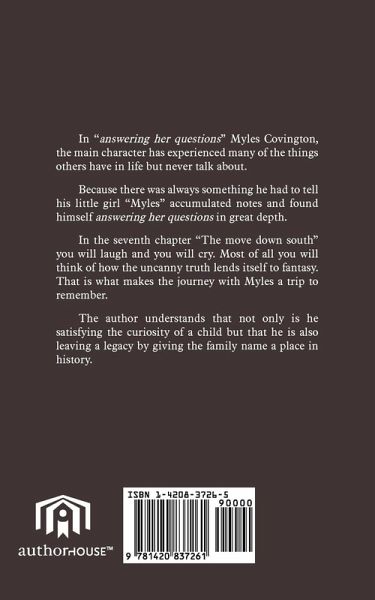 In "answering her questions" Myles Covington, the main character has experienced many of the things others have in life but never talk about. Because there was always something he had to tell his little girl "Myles" accumulated notes and found himself answering her questions in great depth. In the seventh chapter "The move down south" you will laugh and you will cry. Most of all you will think of how the uncanny truth lends itself to fantasy. That is what makes the journey with Myles a trip to remember. The author understands that not only is he satisfying the curiosity of a child but that he is also leaving a legacy by giving the family name a place in history.