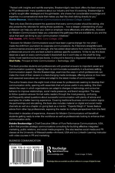 This book provides students and professionals with practical answers to important career and communication questions, helping them to communicate successfully in a business setting. Communication expert, Deirdre Breakenridge, examines the ways in which professionals can make the most of their careers in a fast-changing media landscape, offering advice on how new and seasoned executives can utilize and adapt to the latest modes of communication. The author breaks down the eight most critical areas for professionals seeking to develop their communication skills, opening with essentials that will prove useful in any setting. She then details the ways in which organizations can adapt to changes in technology and consumer behavior to improve relationships, social media presence, and brand recognition. The easy to follow question-answer format walks readers through the most pressing, confusing, and frequently asked questions about successful communication with plenty of advice and examples for a better learning experience. Covering traditional business communication topics like partnerships and storytelling, the book also includes material on digital and social media channels as well as a chapter on giving back as a mentor. "Experts Weigh In" boxes feature advice from other top professionals, exposing the reader to multiple perspectives from the field. Grounded in decades of experience, Answers for Modern Communicators will benefit all students getting ready to enter the workforce as well as professionals looking to enhance their communication skills.