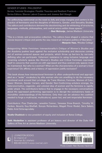 Foreword: Beverly Guy-Sheftall Introduction: "Antagonizing White Feminism." Noelle Chaddock and Beth Hinderliter 1. "White Feminism is the Only Feminism." Noelle Chaddock 2. "Unsettling Dominant Femininities: Promissory Notes Towards an Antiracist Feminist College." Piya Chatterjee 3. "Repo Fem." Timothy W. Gerken 4. "White Innocence as a Feminist Discourse: Intersectionality, and the 2016 US Presidential Elections." Sara Salem 5. "Building Kinfulness." Beth Hinderliter 6. "Trans Youth in Argentina." Pablo Ariel Scharagrodsky and Magalí Pérez Riedel 7. "To Be New, Black, Female and Academic: Renaissance of Womanism within Academia." Vanessa Drew-Branch, Sonyia Richardson, and Laneshia R. Conner 8. "A Rejection of White Feminist Cisgender Allyship: Centering Intersectionality." Beth Hinderliter and Noelle Chaddock
