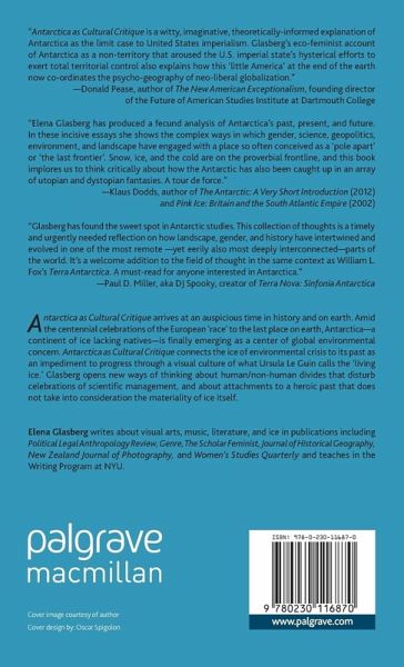 "Antarctica as Cultural Critique is a witty, imaginative, theoretically-informed explanation of Antarctica as the limit case to United States imperialism. Glasberg's eco-feminist account of Antarctica as a non-territory that aroused the U.S. Imperial state's hysterical efforts to exert total territorial control also explains how this 'little America' at the end of the earth now co-ordinates the psycho-geography of neo-liberal globalization." - Donald Pease, author of The New American Exceptionalism, founding director of the Future of American Studies Institute at Dartmouth