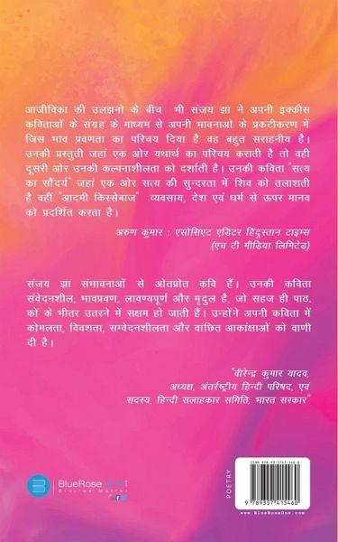 "Antarman Ki 21 Dhune" is a compilation of 21 chosen poems of Sanjay in Hindi. Each of these poems is an expression of his deep sense of truth, which is not dry like bone. His truth is beautiful and meant for the good of society and the world. He firmly believes that we are not separate from our ecosystem, or environment. Hence, his sensitivity towards nature flows out in form of pained words. He is very captivated by the immense potential of human being, who seems to be unaware of the gold mines one is sitting on! Besides Vedanta philosophy, Sanjay is also impressed with the "Allegory" of Pluto and the immortal painting of Von Gog, named "Starry Night". He is a global citizen and places utmost importance of human beings, more than anything else!