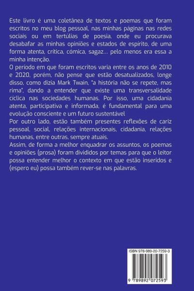 Este livro uma colet nea de textos e poemas que foram escritos no meu blog pessoal, nas minhas p ginas nas redes sociais ou em tert lias de poesia,