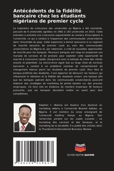 La trajectoire de croissance des universités au Nigeria a été constante, passant de 4 universités agréées en 1962 à 143 universités en 2015. Cette évolution a entraîné une croissance exponentielle du nombre d'inscriptions à l'université, ce qui a conduit à l'expansion des communautés universitaires dans l'ensemble du pays. Cette expansion a donné naissance à un segment de marché bancaire de premier cycle au sein des communautés universitaires du Nigeria et, par extension, a créé de nouvelles opportunités de marché pour les banques. Plusieurs banques ont réagi en proposant une myriade de services et de produits pour exploiter cette opportunité de marché à croissance rapide, élargissant ainsi la latitude de choix des clients actuels et potentiels. La concurrence aiguë due au large choix de services bancaires a conduit à un problème connexe de comportement de changement intense parmi les étudiants de premier cycle. Pour être la banque préférée des étudiants, il est opportun de découvrir les facteurs qui influencent la rétention et la fidélité des étudiants envers une banque afin que les banques opérant dans les communautés universitaires puissent élaborer des stratégies de marketing de pointe basées sur des preuves empiriques. Ce livre met en évidence de manière empirique 36 facteurs puissants, que les banques devraient mettre en avant pour être compétitives.