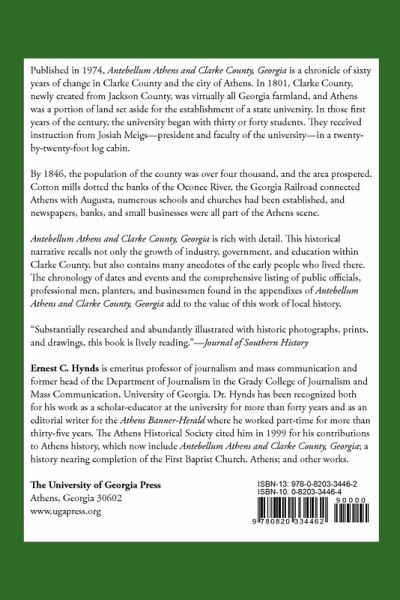 Published in 1974, Antebellum Athens and Clarke County, Georgia is a chronicle of sixty years of change in Clarke County and the city of Athens. In 1801, Clarke County, newly created from Jackson County, was virtually all Georgia farmland, and Athens was a portion of land set aside for the establishment of a state university. In those first years of the century, the university began with thirty or forty students. They received instruction from Josiah Meigs--president and faculty of the university--in a twenty-by-twenty-foot log cabin. By 1846, the population of the county was over four thousand, and the area prospered. Cotton mills dotted the banks of the Oconee River, the Georgia Railroad connected Athens with Augusta, numerous schools and churches had been established, and newspapers, banks, and small businesses were all part of the Athens scene. Antebellum Athens and Clarke County, Georgia is rich with detail. This historical narrative recalls not only the growth of industry, government, and education within Clarke County, but also contains many anecdotes of the early people who lived there. The chronology of dates and events and the comprehensive listing of public officials, professional men, planters, and businessmen found in the appendixes of Antebellum Athens and Clarke County, Georgia add to the value of this work of local history.