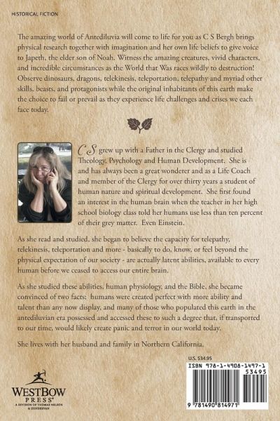 The amazing world of Antediluvia will come to life for you as C S Bergh brings physical research together with imagination and her own life beliefs to give voice to Japeth, the elder son of Noah. Witness the amazing creatures, vivid characters, and incredible circumstances as the World that Was races wildly to destruction! Observe dinosaurs, dragons, telekinesis, teleportation, telepathy and myriad other skills, beasts, and protagonists while the original inhabitants of this earth make the choice to fail or prevail as they experience life challenges and crises we each face today.