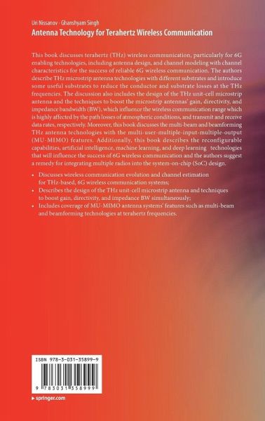 Introduction.- Terahertz Wireless Communication Systems.- Terahertz Wireless Channel Modelling.- Terahertz Antenna for 6G Communication Systems.- Terahertz Microstrip Antenna for 6G Communication Systems.- Terahertz Unit-Cell Microstrip Antenna for 6G.- Gain and Bandwidth Enhancement Techniques for Terahertz Microstrip Antenna.- Multi-Beam and Beamforming Terahertz Array Antenna for 6G.- Reconfigurable Terahertz Microstrip Antenna for 6G.- Artificial Intelligence in Terahertz Array Antenna for 6G.- Terahertz Microstrip Antenna Design, Fabrication, and Measurement.