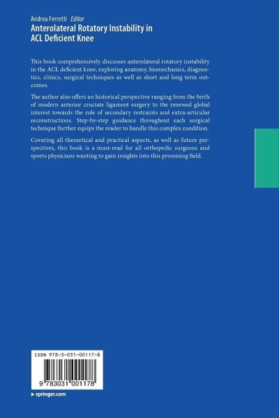 This book comprehensively discusses anterolateral rotatory instability in the ACL deficient knee, exploring anatomy, biomechanics, diagnostics, clinics, surgical techniques as well as short and long term outcomes. The author also offers an historical perspective ranging from the birth of modern anterior cruciate ligament surgery to the renewed global interest towards the role of secondary restraints and extra-articular reconstructions. Step-by-step guidance throughout each surgical technique further equips the reader to handle this complex condition.