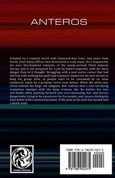 Isolated on a tropical world with thousand-foot trees, two years from Earth, Chief Safety Officer Ben Porterfield is truly alone. He's responsible for over five-hundred colonists of the newly-arrived Third Anteran Survey, and is not prepared for a job he hadn't expected, with far more danger than he'd thought. Struggling with a past police career that had left him with nothing but guilt and traumatic memories, he now strives to keep his group alive, as people start to be consumed by an alien rainforest, taken by a predator never seen before. When the white star orbits behind the large red subgiant, Ben realizes that a new terrifying ecosystem emerges with the deep crimson sky. He battles his own self-doubt while pushing forward into ever-increasing fear and horror, desperately trying to be a protector for his people, and, unsure during his final battle with a monstrous beast, if the pain in his past has turned into a death wish.