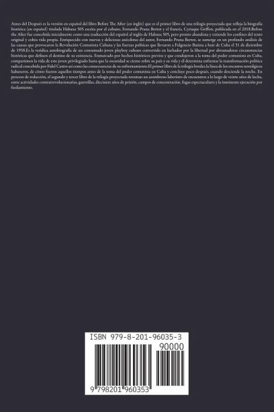 Antes del Después es la versión en español del libro Before The After (en inglés) que es el primer libro de una trilogía proyectada que refleja la biografía histórica (en español) titulada Habana 505 escrita por el cubano, Fernando Pruna Bertot y el francés, Cyriaque Griffon, publicada en el 2018.Before the After fue concebida inicialmente como una traducción del español al inglés de Habana 505, pero pronto abandona y extiende los confines del texto original y cobra vida propia. Enriquecido con nuevas y deliciosas anécdotas del autor, Fernando Pruna Bertot, se sumerge en un profundo análisis de las causas que provocaron la Revolución Comunista Cubana y las fuerzas políticas que llevaron a Fulgencio Batista a huir de Cuba el 31 de diciembre de 1958.Es la verídica autobiografía de un consumado joven playboy cubano convertido en luchador por la libertad por abrumadoras circunstancias históricas que definen el destino de su existencia. Enmarcado por hechos históricos previos y que condujeron a la toma del poder comunista en Cuba, compartimos la vida de este joven privilegiado hasta que la oscuridad se cierne sobre su país y su vida y él determina enfrentar la transformación política radical concebida por Fidel Castro así como las consecuencias de su enfrentamiento.El primer libro de la trilogía bordea la línea de los encantos nostálgicos habaneros, de cómo fueron aquellos tiempos antes de la toma del poder comunista en Cuba y concluye poco después, cuando desciende la noche. En proceso de redacción, el segundo y tercer libro de la trilogía proyectada retoman un asombroso laberinto de encuentros a lo largo de veinte años de lucha, entre actividades contrarrevolucionarias, guerrillas, diecisiete años de prisión, campos de concentración, fugas espectaculares y la inminente ejecución por fusilamiento.