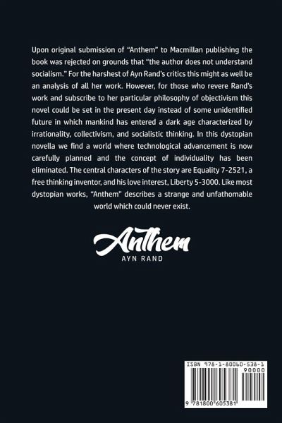 Do you want to read Anthem? If so then keep reading... Upon original submission of "Anthem" to Macmillan publishing the book was rejected on grounds that "the author does not understand socialism." For the harshest of Ayn Rand's critics this might as well be an analysis of all her work. However, for those who revere Rand's work and subscribe to her particular philosophy of objectivism this novel could be set in the present day instead of some unidentified future in which mankind has entered a dark age characterized by irrationality, collectivism, and socialistic thinking. In this dystopian novella we find a world where technological advancement is now carefully planned and the concept of individuality has been eliminated. The central characters of the story are Equality 7-2521, a free thinking inventor, and his love interest, Liberty 5-3000. Like most dystopian works, "Anthem" describes a strange and unfathomable world which could never exist. What are you waiting for Anthem is one click away, select the "Buy Now" button in the top right corner NOW!