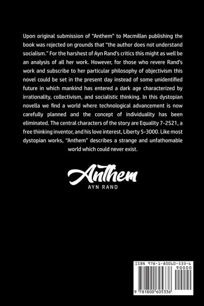 Do you want to read Anthem? If so then keep reading... Upon original submission of "Anthem" to Macmillan publishing the book was rejected on grounds that "the author does not understand socialism." For the harshest of Ayn Rand's critics this might as well be an analysis of all her work. However, for those who revere Rand's work and subscribe to her particular philosophy of objectivism this novel could be set in the present day instead of some unidentified future in which mankind has entered a dark age characterized by irrationality, collectivism, and socialistic thinking. In this dystopian novella we find a world where technological advancement is now carefully planned and the concept of individuality has been eliminated. The central characters of the story are Equality 7-2521, a free thinking inventor, and his love interest, Liberty 5-3000. Like most dystopian works, "Anthem" describes a strange and unfathomable world which could never exist. What are you waiting for Anthem is one click away, select the "Buy Now" button in the top right corner NOW!