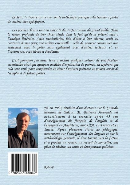 Lecteur, tu trouveras ici une courte anthologie poétique sélectionnée à partir de deux critères distincts : celui du plaisir de savourer la poésie par la lecture, et celui du plaisir de comprendre le sens poétique. A cet effet, on trouvera un abrégé de versification ainsi que des exemples d'explications orale et écrite de poèmes susceptibles d'inciter les élèves et étudiants à lire, réciter, commenter et écrire de la poésie.