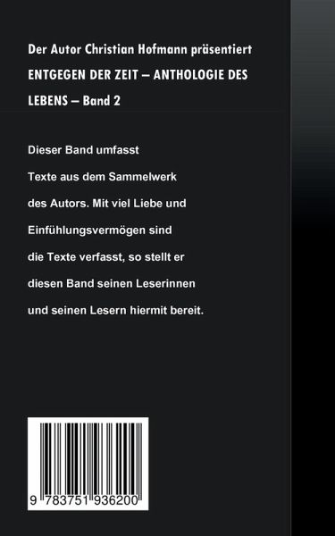 Dieser Band Anthologie des Lebens 2 ist der zweite Teil einer Trilogie von Texten aus dem Leben. Verfasst vom Autor der Entgegen der Zeit Reihe. Jeder Text des Autors ist mit Liebe und Leidenschaft zur Sprache niedergeschrieben. Der Autor selbst sagtEin Leben ohne Schreiben, sei für ihn nicht mehr denkbar!