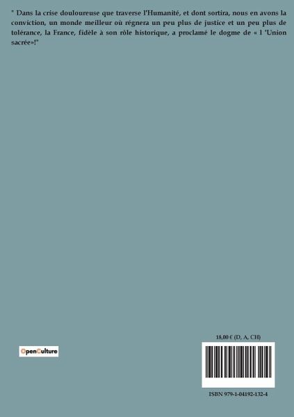 " Dans la crise douloureuse que traverse l'Humanité, et dont sortira, nous en avons la conviction, un monde meilleur où régnera un peu plus de justice et un peu plus de tolérance, la France, fidèle à son rôle historique, a proclamé le dogme de « l 'Union sacrée»!"