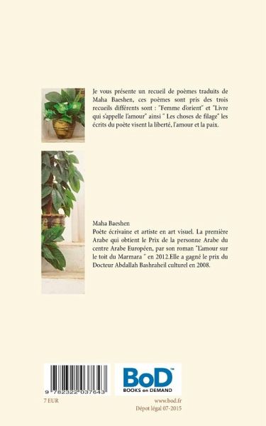 Je vous présente un recueil de poèmes de Maha Baeshen, ces poèmes sont pris des trois recueils différents sont : "Femme d'orient" et"Livre qui s'appelle l'amour" et " Les choses de filage" les écrits du poète visent la liberté, l'amour et la paix.