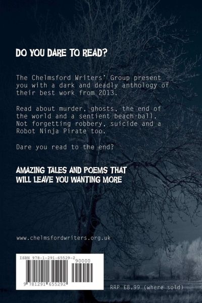 The Chelmsford Writers' Group present you with a dark and deadly anthology of their best work from 2013. Read about murder, ghosts, the end of the world and a sentient beach ball. Not forgetting robbery, suicide and a robot ninja pirate too. A great collection of short stories and poems that will leave you wanting more.