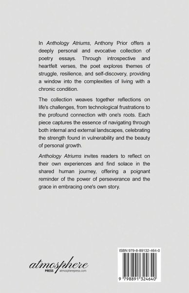 In Anthology Atriums, Anthony Prior offers a deeply personal and evocative collection of poetry essays. Through introspective and heartfelt verses, the poet explores themes of struggle, resilience, and self-discovery, providing a window into the complexities of living with a chronic condition. The collection weaves together reflections on life's challenges, from technological frustrations to the profound connection with one's roots. Each piece captures the essence of navigating through both internal and external landscapes, celebrating the strength found in vulnerability and the beauty of personal growth. Anthology Atriums invites readers to reflect on their own experiences and find solace in the shared human journey, offering a poignant reminder of the power of perseverance and the grace in embracing one's own story.