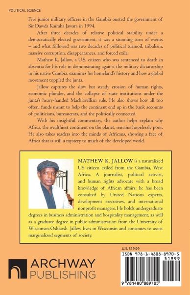 Five junior military officers in the Gambia ousted the government of Sir Dawda Kairaba Jawara in 1994. After three decades of relative political stability under a democratically elected government, it was a stunning turn of events - and what followed was two decades of political turmoil, tribalism, massive corruption, disappearances, and forced exile. Mathew K. Jallow, a U.S. citizen who was sentenced to death in absentia for his role in demonstrating against the military dictatorship in his native Gambia, examines his homeland's history and how a global movement toppled the junta. Jallow captures the slow but steady erosion of human rights, economic plunder, and the collapse of state institutions under the junta's heavy-handed Machiavellian rule. He also shows how all too often, funds meant to help the continent end up in the bank accounts of politicians, bureaucrats, and the politically connected. With his insightful commentary, the author helps explain why Africa, the wealthiest continent on the planet, remains hopelessly poor. He also takes readers into the minds of Africans, showing a face of Africa that is still a mystery to much of the developed world.