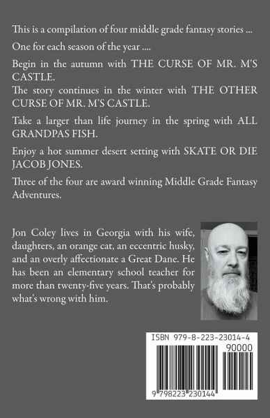 This is a compilation of four middle grade fantasy stories ... One for each season of the year .... Begin in the autumn with THE CURSE OF MR. M'S CASTLE. The story continues in the winter with THE OTHER CURSE OF MR. M'S CASTLE. Take a larger than life journey in the spring with ALL GRANDPAS FISH. Enjoy a hot summer desert setting with SKATE OR DIE JACOB JONES.