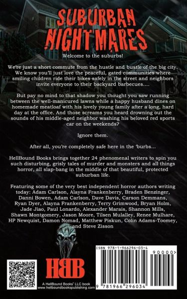 Welcome to the suburbs! We're just a short commute from the hustle and bustle of the big city. We know you'll just love the peaceful, gated communities where smiling children ride their bikes safely in the street and neighbors invite everyone to their backyard barbecues.... But pay no mind to that shadow you thought you saw running between the well-manicured lawns while a happy husband dines on homemade meatloaf with his lovely young family after a long, hard day at the office. And those screams you heard drowning out the sounds of his middle-aged neighbor washing his beloved red sports car on the weekends? Ignore them. After all, you're completely safe here in the 'burbs... HellBound Books brings together 24 phenomenal writers to spin you such disturbing, grisly tales of murder and monsters and all things horror, all slap-bang in the middle of that beautiful, protected suburban life. Featuring some of the very best independent horror authors writing today: Adam Carlson, Alayna Frankenberry, Braden Benzinger, Danni Bowen, Adam Carlson, Dave Davis, Carson Demmans, Ryan Dyer, Alayna Frankenberry, Terry Grimwood, Bryan Holm, Jade Jiao, Paul Lonardo, Alexander Marais, Shannon Mills, Shawn Montgomery, Jason Moore, Tilsen Mulalley, Renee Mulhare, HP Newquist, Damon Nomad, Matthew Piskun, Colin Adams-Toomey and Steve Zisson