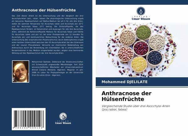 Das Ziel dieser Arbeit ist die Untersuchung und der Vergleich der drei Ascochyta-Arten (pisi, rabiei, fabae). Die physiologische Untersuchung ergab ein besseres Myzelwachstum auf Mathur-Medium bei pH 5 für alle drei Arten, wobei die optimale Temperatur für Ascochyta rabiei und Ascochyta pisi 22°C und für Ascochyta fabae 15°C betrug. Die Stickstoffquelle, die das Myzelwachstum fördert, ist Kaliumnitrat und Asparagin für alle drei Ascochyta-Arten, während die Kohlenstoffquelle Maltose für Ascochyta fabae und Stärke für Ascochyta rabiei und pisi ist, bei einer Photoperiode von 12 Stunden für Ascochyta pisi und kontinuierlicher Beleuchtung für die anderen Arten. Die Untersuchung des enzymatischen Polymorphismus durch Elektrophorese ergab einen leichten Unterschied zwischen den 03 Ascochyta-Arten bei den Esterasen und der sauren Phosphatase. Versuche zur chemischen Bekämpfung von Anthracnose durch die Verwendung von Chemikalien, die in unterschiedlichen Konzentrationen in das Medium eingearbeitet wurden, zeigten eine hemmende Wirkung auf das Myzelwachstum der drei Ascochyta-Arten.