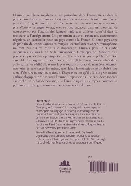 L'Europe s'anglicise rapidement, en particulier dans l'économie et dans la production des connaissances. La science a certainement besoin d'une lingua franca, et l'anglais joue bien ce rôle, mais les universités ne se contentent plus d'utiliser la lingua franca, elles se sont engagées dans un processus de remplacement par l'anglais des langues nationales utilisées jusqu'ici dans la recherche et l'enseignement. Ce phénomène a des conséquences extrêmement négatives, en particulier pour un pays comme la France. Les argumentaires en faveur de l'anglicisation sont examinés dans ce livre, mais en réalité elle se met le plus souvent en place de manière spontanée, sans prise de conscience des enjeux, sans débat démocratique, pour obéir à une sorte d'obscure injonction sociétale. L'hypothèse est qu'il y là des phénomènes anthropologiques inconscients à l'¿uvre, qui sont explorés dans ce livre.