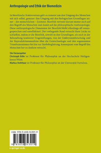 In bioethische Kontroversen geht es zumeist um den Umgang des Menschen mit sich selbst, genauer: den Umgang mit den biologischen Grundlagen seiner - der menschlichen - Existenz. Bioethik verweist darum immer auch auf den Begriff des Menschen und damit auf die philosophische Anthropologie. Diese anthropologische Dimension der Bioethik bleibt allerdings oft unausgesprochen und unreflektiert. Der vorliegende Band versucht diese Lücke zu schließen, indem er die Bioethik, sowohl in den Grundlagen, als auch in der Behandlung konkreter Fragestellungen, von der Embryonenforschung und der Reproduktionsmedizin über die Gentechnologie und den sogenannten Transhumanismus bis hin zur Sterbebegleitung, konsequent vom Begriff des Menschen her zu denken versucht.