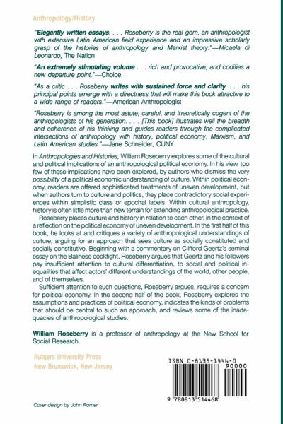 "Elegantly written essays. . . . Roseberry is the real gem, an anthropologist with extensive Latin American field experience and an impressive scholarly grasp of the histories of anthropology and Marxist theory."--Micaela di Leonardo, The Nation "An extremely stimulating volume . . . rich and provocative, and codifies a new depature point."--Choice "As a critic . . . Roseberry writes with sustained force and clarity. . . . his principal points emerge with a directness that will make this book attractive to a wide range of readers."--American Anthropologist "Roseberry in among the most astute, careful, and theoretically cogent of the anthropologists of his generation. . . . [This book] illustrates well the breadth and coherence of his thinking and guides the reader through the complicated intersections of anthropology with history, political economy, Marxism, and Latin American studies."--Jane Schneider, CUNY In Anthropologies and Histories, William Roseberry explores some of the cultural and political implications of an anthropological political economy. In his view, too few of these implications have been explored by authors who dismiss the very possibility of a political economic understanding of culture. Within political economy, readers are offered sophisticated treatments of uneven development, but when authors turn to culture and politics, they place contradictory social experiences within simplistic class or epochal labels. Within cultural anthropology, history is often little more than new terrain for extending anthropological practice. Roseberry places culture and history in relation to each other, in the context of a reflection on the political economy of uneven development. In the first half of this books, he looks at and critiques a variety of anthropological understandings of culture, arguing for an approach that sees culture as socially constituted and socially constitutive. Beginning with a commentary on Clifford Geertz's seminal essay on the Balinese cockfight, Roseberry argues that Geertz and his followers pay insufficient attention to cultural differentiation, to social and political inequalities that affect actors' different understandings of the world, other people, and of themselves. Sufficient attention to such questions, Roseberry argues, requires a concern for political economy. In the second half of the book, Roseberry explores the assumptions and practices of political economy, indicates the kind of problems that should be central to such an approach, and reviews some of the inadequacies of anthropological studies. William Roseberry is a professor of anthropology at the New School for Social Research.