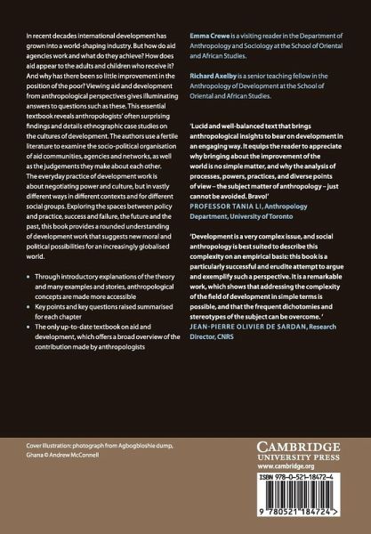 In recent decades international development has grown into a world-shaping industry. But how do aid agencies work and what do they achieve? How does aid appear to the adults and children who receive it? And why has there been so little improvement in the position of the poor? Viewing aid and development from anthropological perspectives gives illuminating answers to questions such as these. This essential textbook reveals anthropologists' often surprising findings and details ethnographic case studies on the cultures of development. The authors use a fertile literature to examine the socio-political organisation of aid communities, agencies and networks, as well as the judgements they make about each other. The everyday practice of development work is about negotiating power and culture, but in vastly different ways in different contexts and for different social groups. Exploring the spaces between policy and practice, success and failure, the future and the past, this book provides a rounded understanding of development work that suggests new moral and political possibilities for an increasingly globalised world.