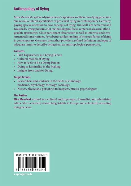 Mira Menzfeld explores dying persons' experiences of their own dying processes. She reveals cultural specificities of pre-exital dying in contemporary Germany, paying special attention to how concepts of dying '(un)well' are perceived and realized by dying persons. Her methodological focus centers on classical ethnographic approaches: Close participant observation as well as informal and semi-structured conversations. For a better understanding of the specificities of dying in contemporary Germany, the author provides a refined definition catalogue of adequate terms to describe dying from an anthropological perspective.