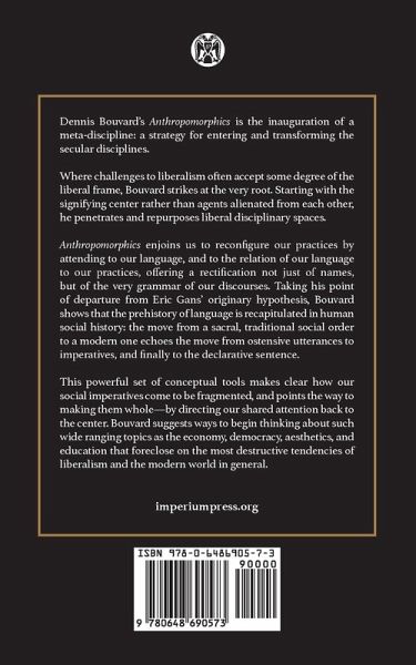 Dennis Bouvard’s Anthropomorphics is the inauguration of a meta-discipline: a strategy for entering and transforming the secular disciplines. Where challenges to liberalism often accept some degree of the liberal frame, Bouvard strikes at the very root. Starting with the signifying center rather than agents alienated from each other, he penetrates and repurposes liberal disciplinary spaces. Anthropomorphics enjoins us to reconfigure our practices by attending to our language, and to the relation of our language to our practices, offering a rectification not just of names, but of the very grammar of our discourses. Taking his point of departure from Eric Gans’ originary hypothesis, Bouvard shows that the prehistory of language is recapitulated in human social history: the move from a sacral, traditional social order to a modern one echoes the move from ostensive utterances to imperatives, and finally to the declarative sentence. This powerful set of conceptual tools makes clear how our social imperatives come to be fragmented, and points the way to making them whole—by directing our shared attention back to the center. Bouvard suggests ways to begin thinking about such wide ranging topics as the economy, democracy, aesthetics, and education that foreclose on the most destructive tendencies of liberalism and the modern world in general.
