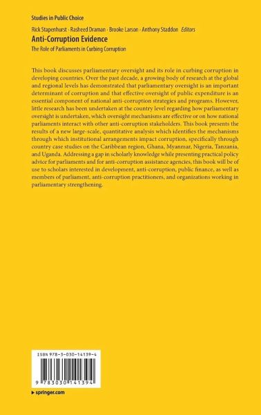 This book discusses parliamentary oversight and its role in curbing corruption in developing countries. Over the past decade, a growing body of research at the global and regional levels has demonstrated that parliamentary oversight is an important determinant of corruption and that effective oversight of public expenditure is an essential component of national anti-corruption strategies and programs. However, little research has been undertaken at the country level regarding how parliamentary oversight is undertaken, which oversight mechanisms are effective or on how national parliaments interact with other anti-corruption stakeholders. This book presents the results of a new large-scale, quantitative analysis which identifies the mechanisms through which institutional arrangements impact corruption, specifically through country case studies on the Caribbean region, Ghana, Myanmar, Nigeria, Tanzania, and Uganda. Addressing a gap in scholarly knowledge while presenting practical policyadvice for parliaments and for anti-corruption assistance agencies, this book will be of use to scholars interested in development, anti-corruption, public finance, as well as members of parliament, anti-corruption practitioners, and organizations working in parliamentary strengthening.