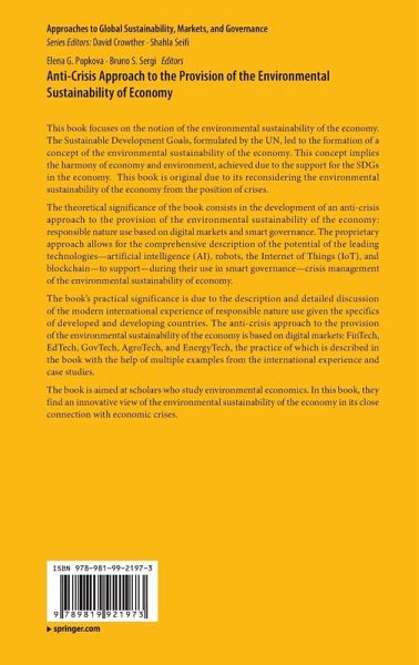 The book's practical significance is due to the description and detailed discussion of the modern international experience of responsible nature use given the specifics of developed and developing countries. The anti-crisis approach to the provision of the environmental sustainability of the economy is based on digital markets: FinTech, EdTech, GovTech, AgroTech, and EnergyTech, the practice of which is described in the book with the help of multiple examples from the international experience and case studies.