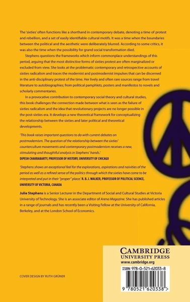 The sixties was a time when the boundaries between the political and the aesthetic were deliberately blurred and, according to some critics, the time when the possibility for grand social transformation died. Stephens questions the frameworks that inform commonplace understandings of this period, arguing that the most distinctive forms of sixties protest are often marginalized or excluded from view. She looks at the problematic contemporary and retrospective accounts of sixties radicalism, and traces the modernist and postmodern impulses that can be discerned in the anti-disciplinary protest of the time. Stephens develops a new theoretical framework for conceptualizing the relationship between the sixties and later political and theoretical developments.