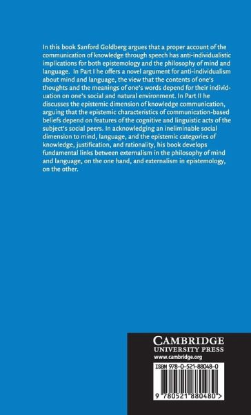 Sanford Goldberg argues that a proper account of the communication of knowledge through speech has anti-individualistic implications for both epistemology and the philosophy of mind and language. In Part 1 he offers a novel argument for anti-individualism about mind and language, the view that the contents of one's thoughts and the meanings of one's words depend for their individuation on one's social and natural environment. In Part 2 he discusses the epistemic dimension of knowledge communication, arguing that the epistemic characteristics of communication-based beliefs depend on features of the cognitive and linguistic acts of the subject's social peers. In acknowledging an ineliminable social dimension to mind, language, and the epistemic categories of knowledge, justification, and rationality, his book develops fundamental links between externalism in the philosophy of mind and language, on the one hand, and externalism is epistemology, on the other.