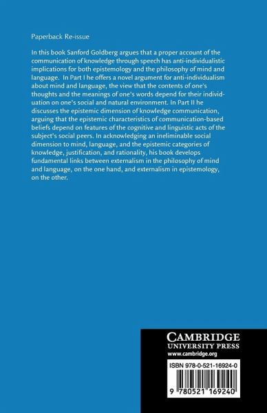 Sanford C. Goldberg argues that a proper account of the communication of knowledge through speech has anti-individualistic implications for both epistemology and the philosophy of mind and language. In Part I he offers a novel argument for anti-individualism about mind and language, the view that the contents of one's thoughts and the meanings of one's words depend for their individuation on one's social and natural environment. In Part II he discusses the epistemic dimension of knowledge communication, arguing that the epistemic characteristics of communication-based beliefs depend on features of the cognitive and linguistic acts of the subject's social peers. In acknowledging an ineliminable social dimension to mind, language, and the epistemic categories of knowledge, justification, and rationality, his book develops fundamental links between externalism in the philosophy of mind and language, on the one hand, and externalism is epistemology, on the other.