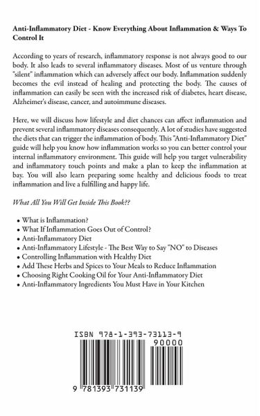 Anti-Inflammatory Diet - Know Everything About Inflammation & Ways To Control It According to years of research, inflammatory response is not always good to our body. It also leads to several inflammatory diseases. Most of us venture through "silent" inflammation which can adversely affect our body. Inflammation suddenly becomes the evil instead of healing and protecting the body. The causes of inflammation can easily be seen with the increased risk of diabetes, heart disease, Alzheimer's disease, cancer, and autoimmune diseases. Here, we will discuss how lifestyle and diet chances can affect inflammation and prevent several inflammatory diseases consequently. A lot of studies have suggested the diets that can trigger the inflammation of body. This "Anti-Inflammatory Diet" guide will help you know how inflammation works so you can better control your internal inflammatory environment. This guide will help you target vulnerability and inflammatory touch points and make a plan to keep the inflammation at bay. You will also learn preparing some healthy and delicious foods to treat inflammation and live a fulfilling and happy life. What All You Will Get Inside This Book??What is Inflammation? What If Inflammation Goes Out of Control? Anti-Inflammatory Diet Anti-Inflammatory Lifestyle - The Best Way to Say "NO" to Diseases Controlling Inflammation with Healthy Diet Add These Herbs and Spices to Your Meals to Reduce Inflammation Choosing Right Cooking Oil for Your Anti-Inflammatory Diet Anti-Inflammatory Ingredients You Must Have in Your Kitchen