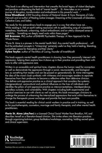 Written in an accessible and spiritual tone, chapters discuss the human need for connection as well as demonstrate the oppression through a social, neuroscientific, and biological lens as something that resides and can be passed on generationally. St. Aime interrogates the idea of the moral cloak symbiotic with whiteness and encourages readers to separate themselves from their profession to become a reflective rather than defensive clinician. She defines anti-oppressive practice as a clinical approach that considers the systemic, intergenerational, sociocultural and political influences on the lives of individuals and identifies the pillars of anti-oppressive practice as interconnectedness, interdependence, boundless curiosity, and vulnerability. With chapters including both experimental and practical exercises to use with clients as well as alone, this book encourages clinicians to undergo the process of unlearning the internalized oppressions that exist within themselves to change the therapeutic power exchange and provide the best care possible.