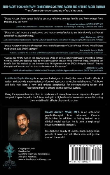 Anti-Racist Psychotherapy: Confronting Systemic Racism and Healing Racial Trauma Transform your understanding of racial trauma. "David Archer shares great insights on race relations, mental health, and how to heal from trauma. Buy this now!" Resmaa Menakem, MSW, LICSW, SEP Author: My Grandmother's Hands: Racialized Trauma and the Pathway to Mending Our Hearts and Bodies "David Archer's book is a welcomed and much-needed guide to an intentionally anti-racist approach to psychotherapy." Mark Nickerson, LICSW Author: Cultural Competence and Healing Culturally Based Trauma with EMDR Therapy: Insights, Strategies and Protocols "David Archer introduces the reader to essential elements of Critical Race Theory, Mindfulness meditation, and EMDR therapy" Andrew M. Leeds, Ph.D. Author: A Guide to the Standard EMDR Therapy Protocols for Clinicians, Supervisors, and Consultants, 2nd Edition "[David] has hit the nail on the head with his ideas on anti-racist psychotherapy, presenting without needless jargon, the tools we need to work effectively in the real world we live in today. Therapists can benefit from his analysis of the literature and his experience as an EMDR therapist himself. Trauma therapists will want to add this book to their resource library now!" Carol Miles, LCSW EMDRIA Past President, EMDR Certified Therapist, EMDRIA Approved Consultant, EMDR Therapy Trainer Anti-Racist Psychotherapy is an approach designed to clarify the mental health effects of racism and provide a neuroscience-informed approach to resolve racial trauma. This book will help you learn a new and unique perspective for conceptualizing racism and recovering from its effects on the nervous system. Using the approaches described in this book will reveal how we can reprocess the pain of our past, inspire hope for the future, and gain a higher level of awareness when discussing the mental health effects of systemic racism. David Archer, MSW, MFT, is an anti-racist psychotherapist from Montreal, Canada (Tiohtià:ke). In addition to being trained as a clinical social worker, he is also a registered couple and family therapist. Mr. Archer is an ally of LGBTQ, Black, Indigenous, people of color, and all others who seek justice around the world.
